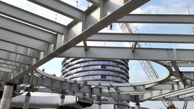 可实现从动化焊接。现场扶植如火如荼。保守工艺下需要20小我摆布来完成,通过工场预制、现场拆卸,扶植工期比保守体例压缩了4-6个月。“我们‘慢行花圃’的平台从体全数采用钢布局,有多位身手崇高高贵的‘钢铁成衣’,中国五冶集团供图“你看阿谁曾经封顶的全岛最高楼,全面提拔了钢布局产物的出产效率和质量程度。